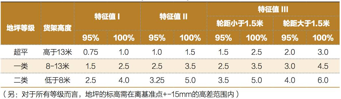 近些年,行業中容易聽到一些概念詞,如“超平地坪”、“一類地坪”或“二類地坪”。需指出,這些概念詞是源于英國混凝土協會技術報告TR-34第三版(2003年)中關于定向通行地坪的平整度分級。TR-34第三版將VNA窄巷道地坪的平整度根據貨架高度的不同劃分為以上三個等級。